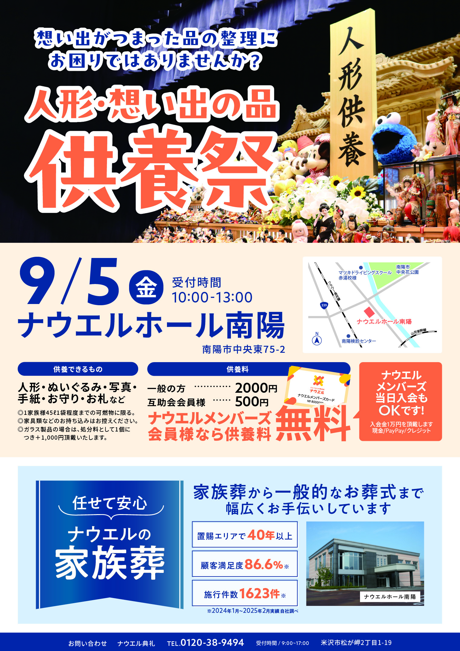 ナウエルホール南陽にて「人形・想い出の品供養祭」を開催します。人形やぬいぐるみ、写真やお守りなどの供養が可能です。ぜひこの機会にお越しください。