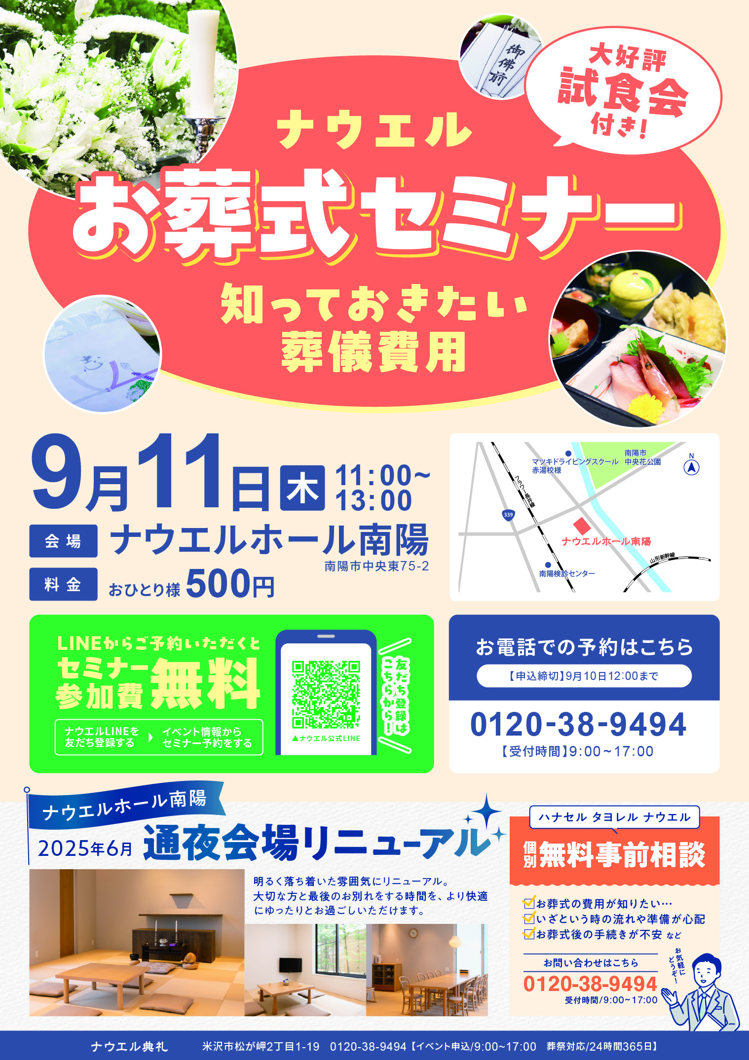 ナウエルホール南陽にて「お葬式セミナー」を開催します。当日は、ナウエルホールのお料理もご試食いただけます。ぜひ皆さまでお越しください。