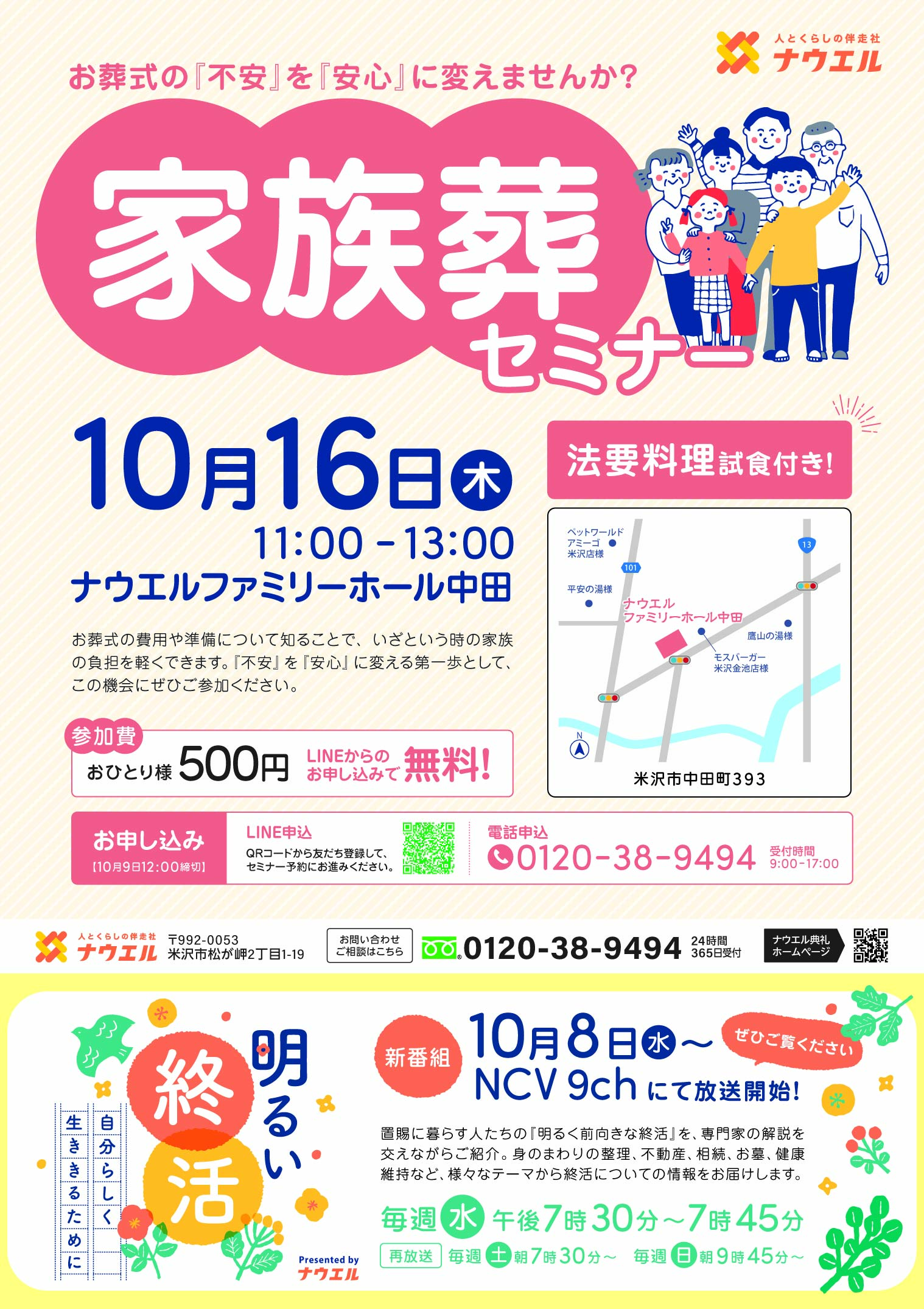ナウエルファミリーホール中田にて「家族葬セミナー」を開催します。当日は、ナウエルホールのお料理もご試食いただけます。ぜひ皆さまでお越しください。