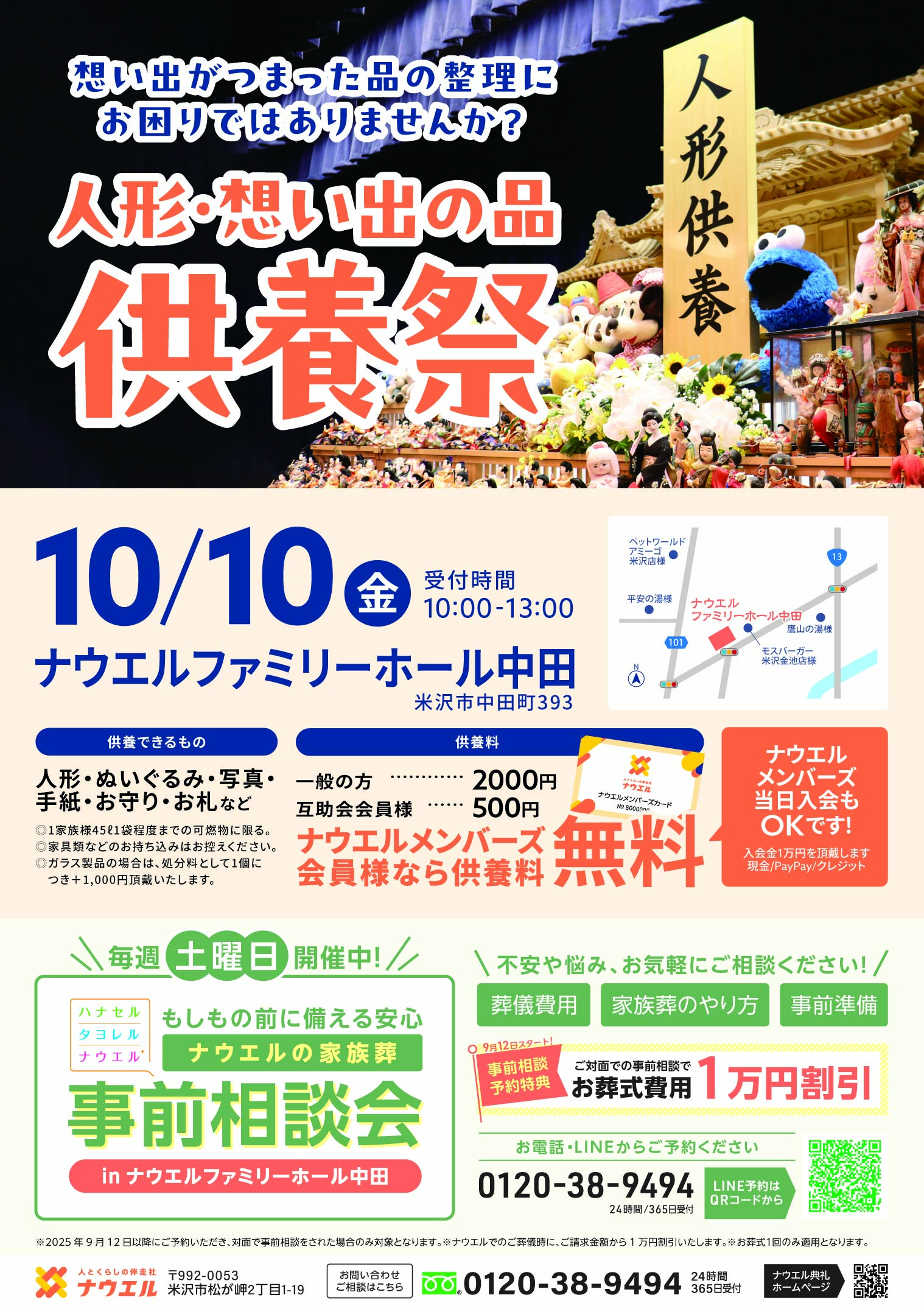 ナウエルファミリーホール中田にて「人形・想い出の品供養祭」を開催します。人形やぬいぐるみ、写真やお守りなどの供養が可能です。ぜひこの機会にお越しください。