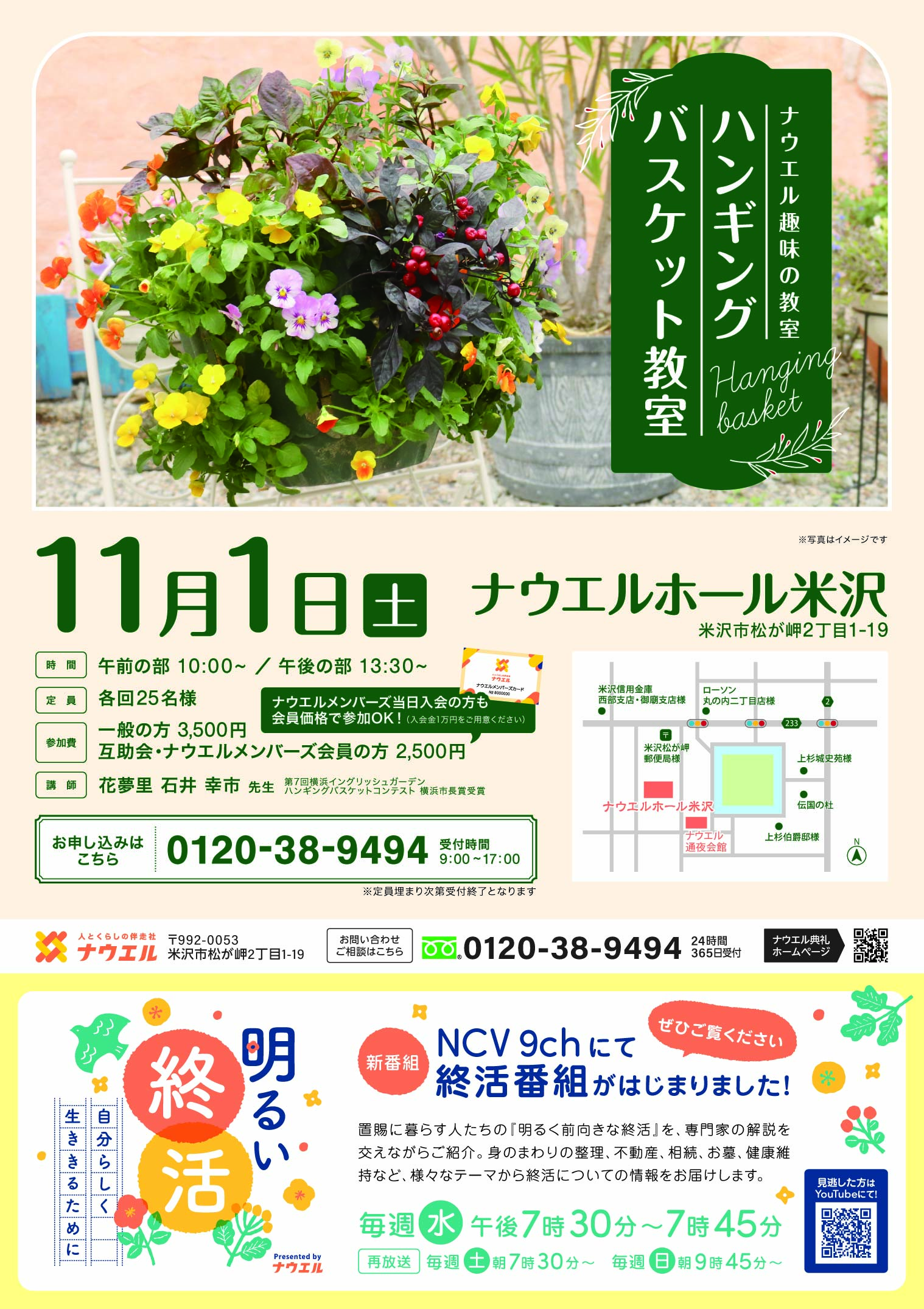 ナウエルホール米沢にて「ハンギングバスケット教室」を開催します。当日は、花夢里の石井幸市先生を講師としてお迎えします。ぜひ皆さまでご参加ください。