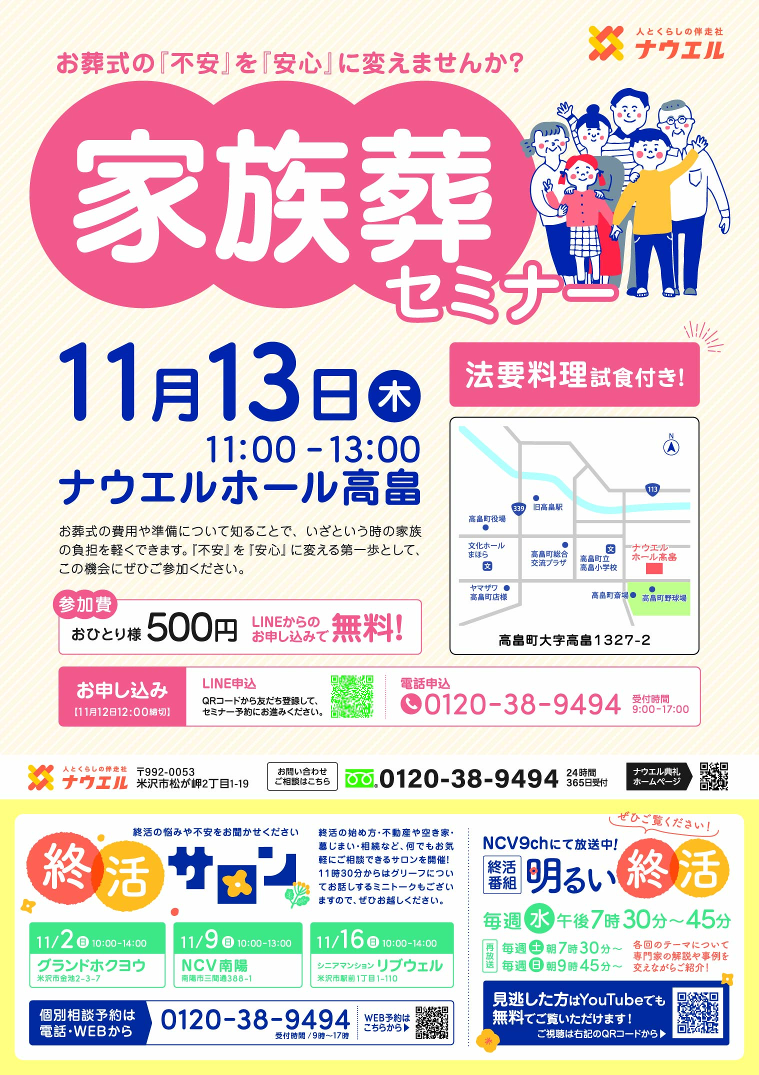 ナウエルホール高畠にて「家族葬セミナー」を開催します。当日は、ナウエルホールのお料理もご試食いただけます。ぜひ皆さまでお越しください。