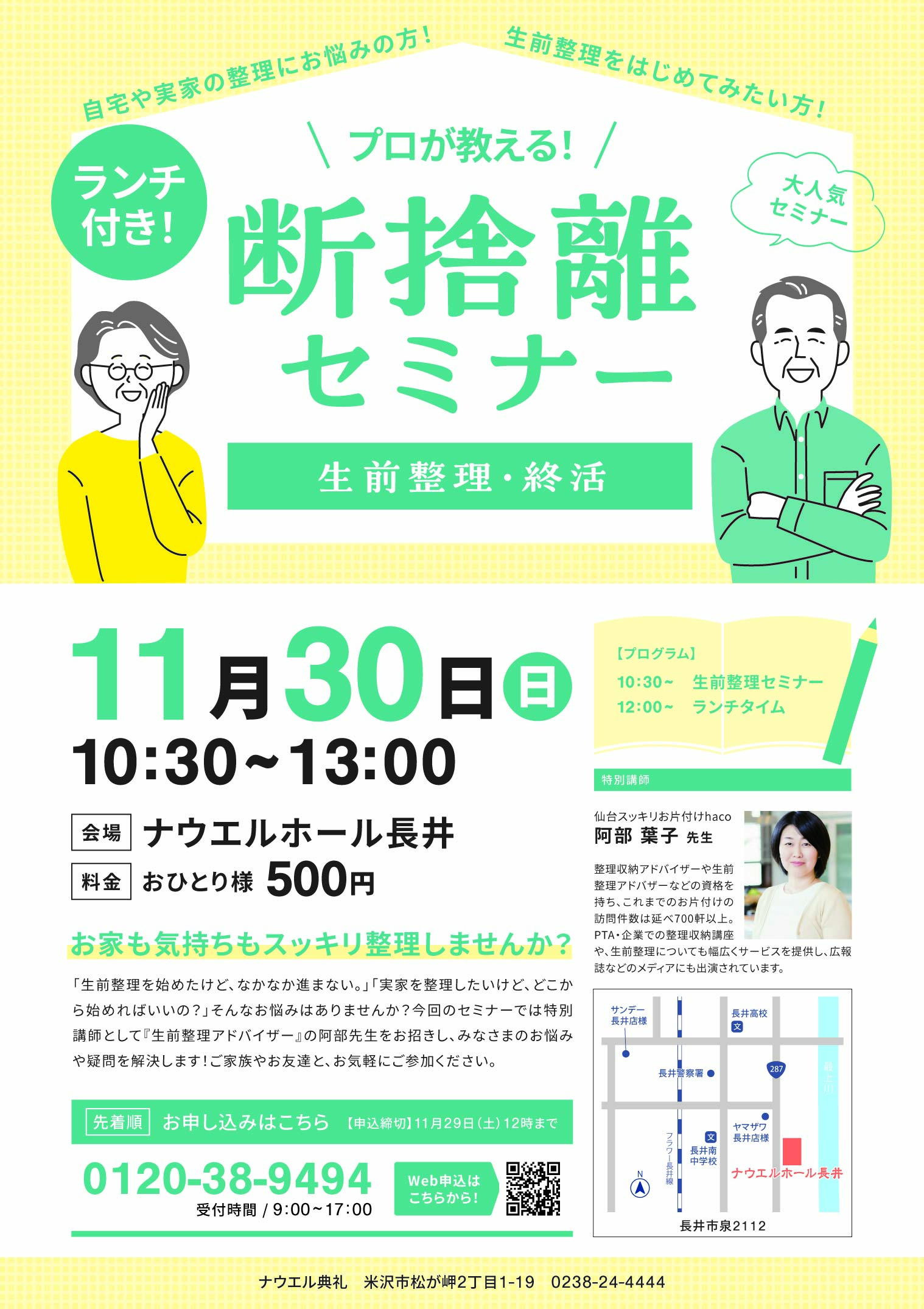 ナウエルホール長井にて「断捨離セミナー」を開催します。当日は、ランチをご用意しております。ぜひ皆さまでお越しください。