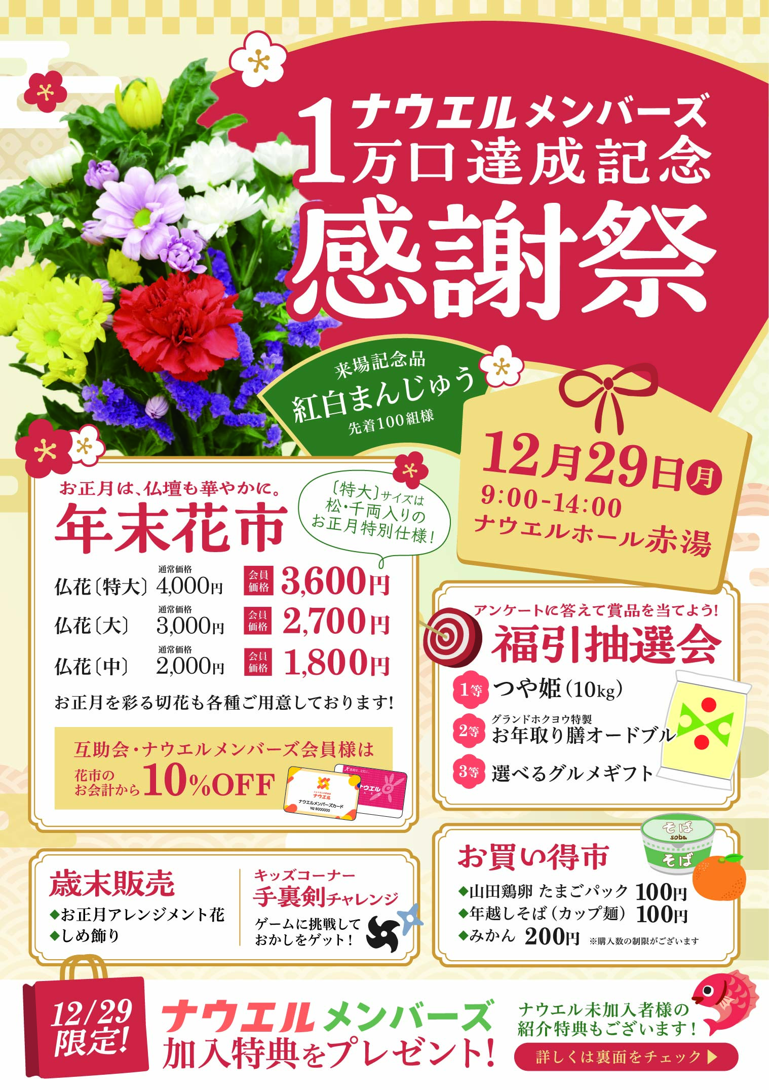 当日は、先着で紅白まんじゅうのプレゼントをはじめ、年末花市の特別価格販売や、豪華賞品が当たる福引抽選会、お買い得市(卵・年越しそば・みかん など)を実施いたします。また、しめ飾り販売やキッズ向けの手裏剣チャレンジなど、ご家族で楽しめる企画もご用意しています。