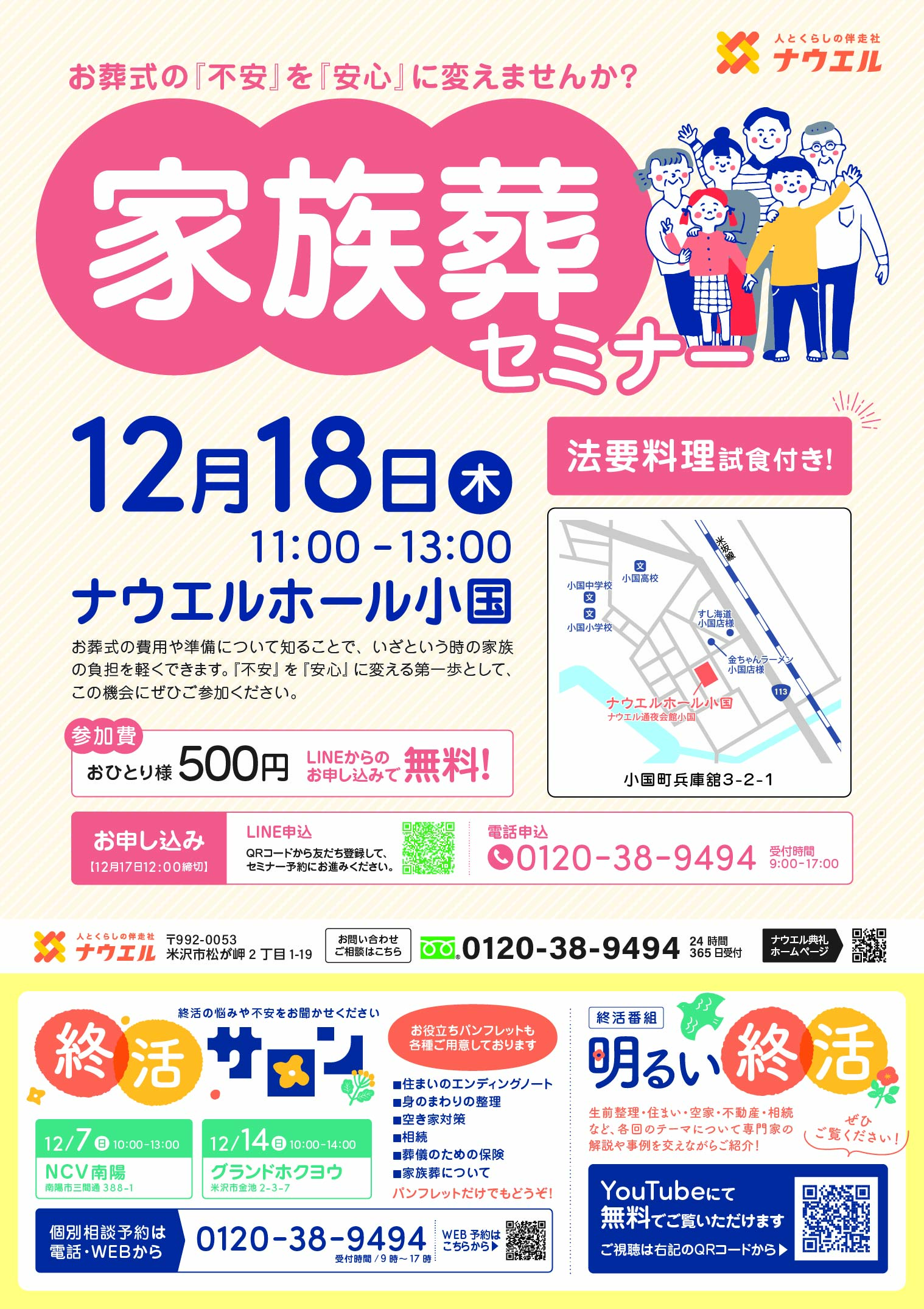 ナウエルホール小国にて「家族葬セミナー」を開催します。当日は、ナウエルホールのお料理もご試食いただけます。ぜひ皆さまでお越しください。