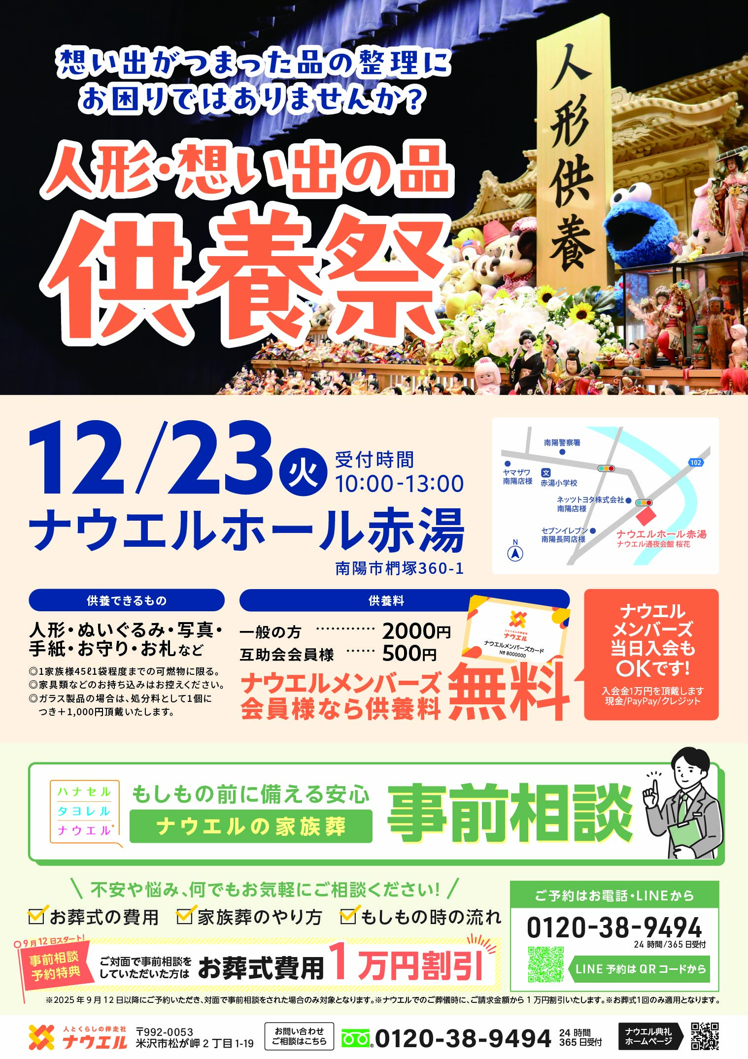 ナウエルホール赤湯にて「人形・想い出の品供養祭」を開催します。人形やぬいぐるみ、写真やお守りなどの供養が可能です。ぜひこの機会にお越しください。