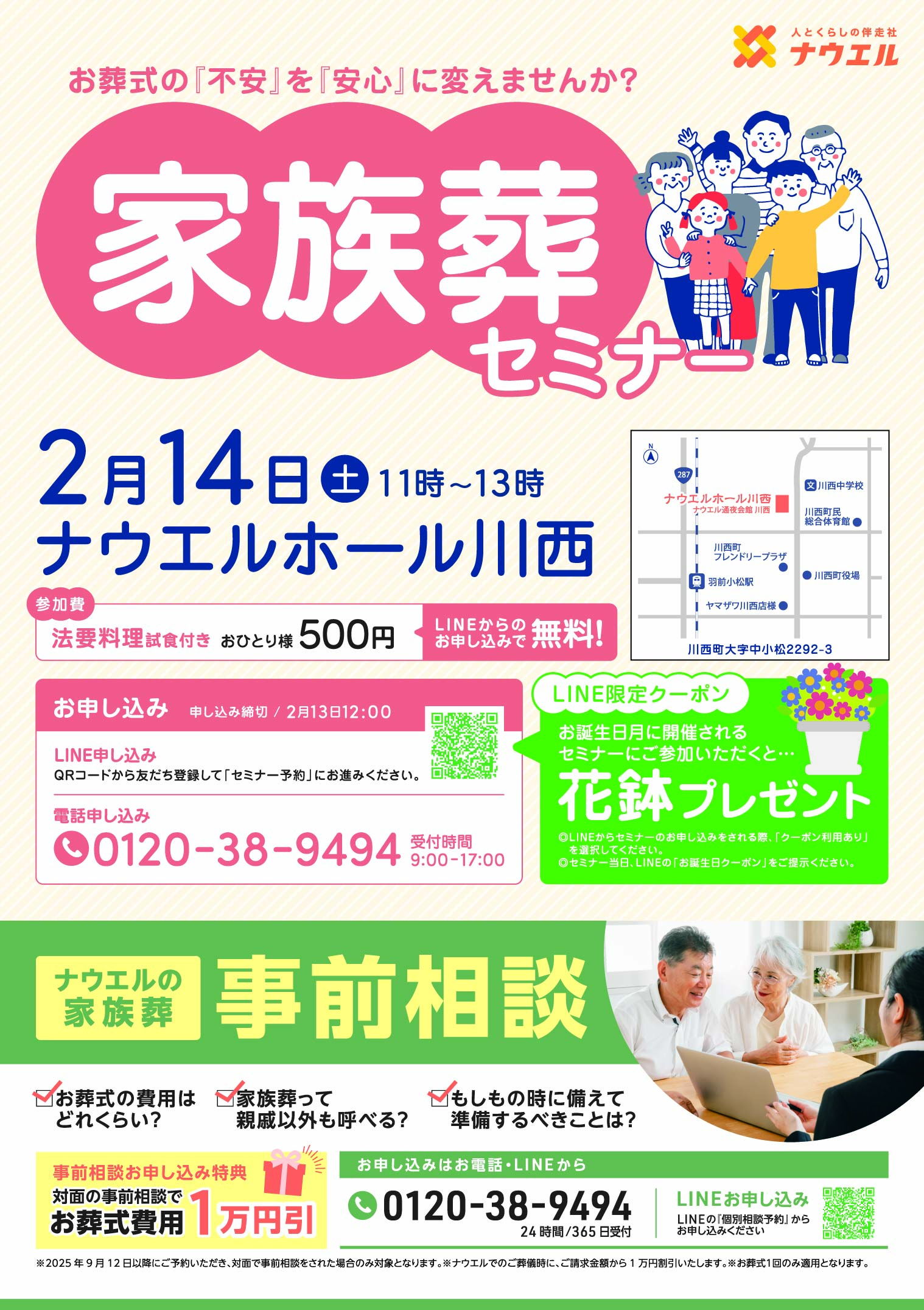 ナウエルホール長井にて「家族葬セミナー」を開催します。当日は、ナウエルホールのお料理もご試食いただけます。ぜひ皆さまでお越しください。