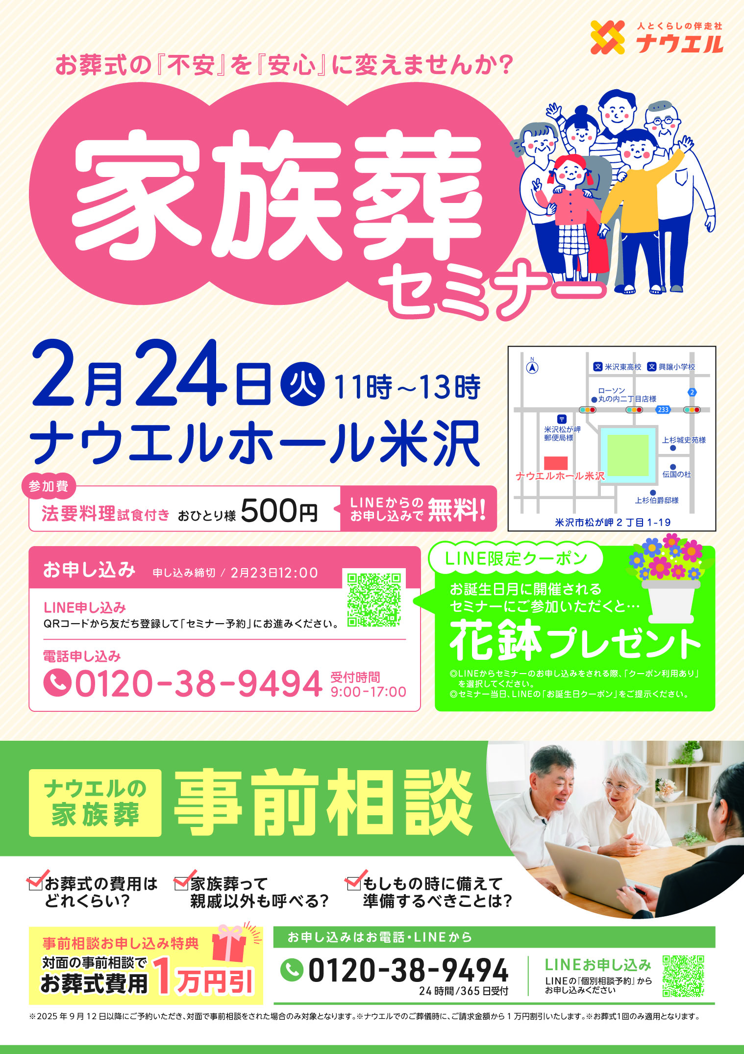 ナウエルホール米沢にて「家族葬セミナー」を開催します。当日は、ナウエルホールのお料理もご試食いただけます。ぜひ皆さまでお越しください。