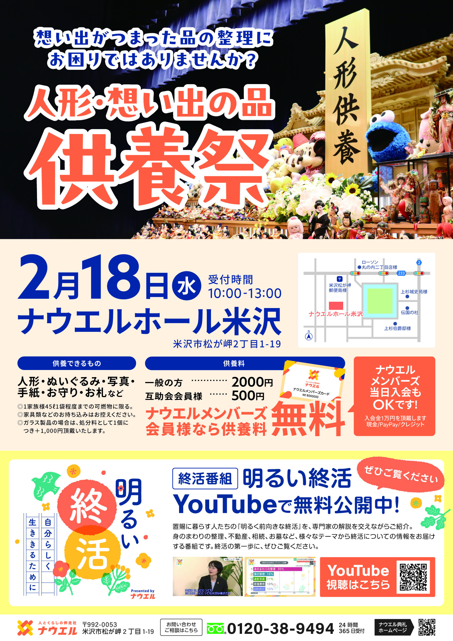 ナウエルホール米沢にて「人形・想い出の品供養祭」を開催します。人形やぬいぐるみ、写真やお守りなどの供養が可能です。ぜひこの機会にお越しください。