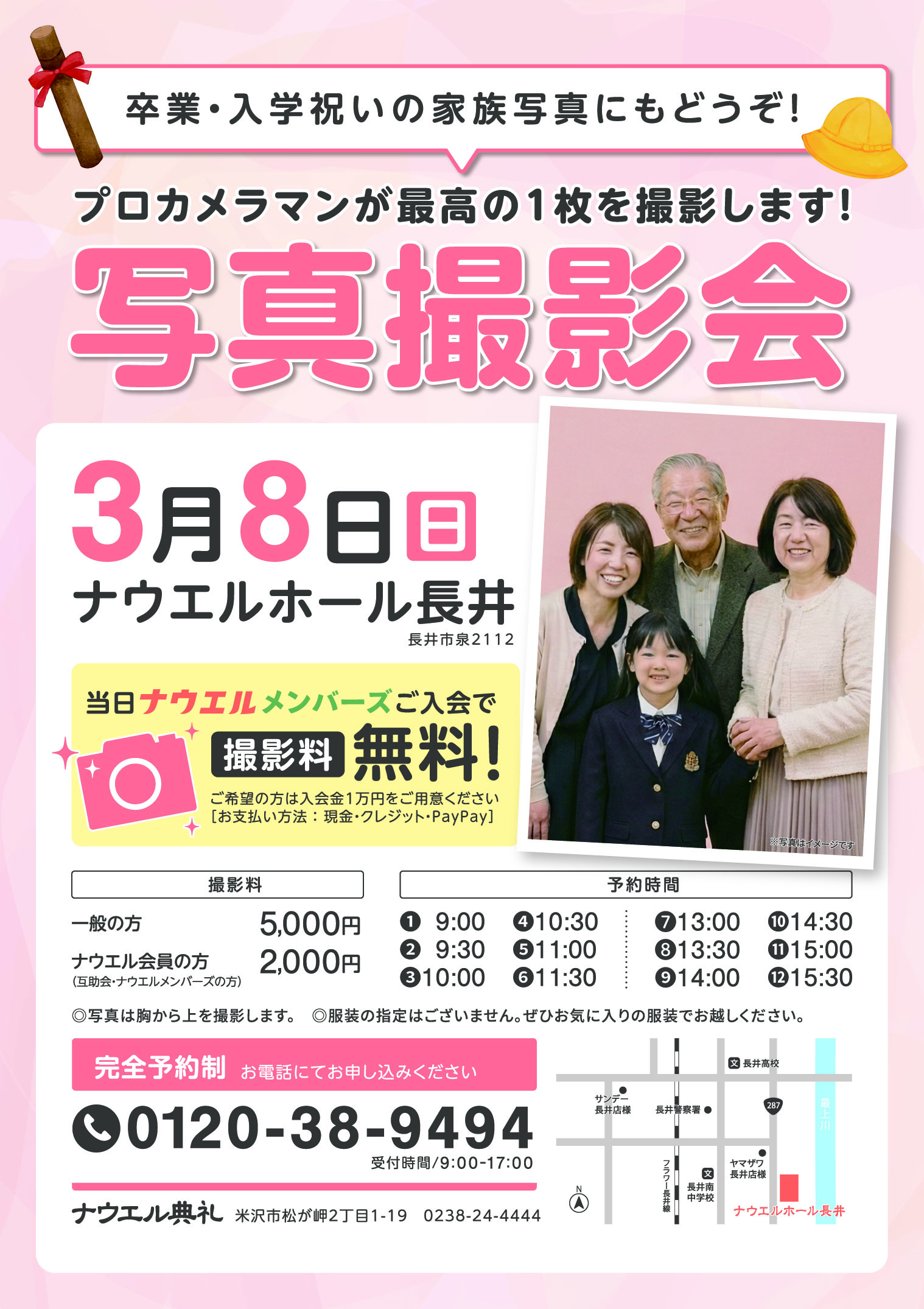 ナウエルホール長井にて「写真撮影会」を開催します。当日のナウエルメンバーズご入会で撮影料は無料に!ぜひ皆さまでご参加ください。